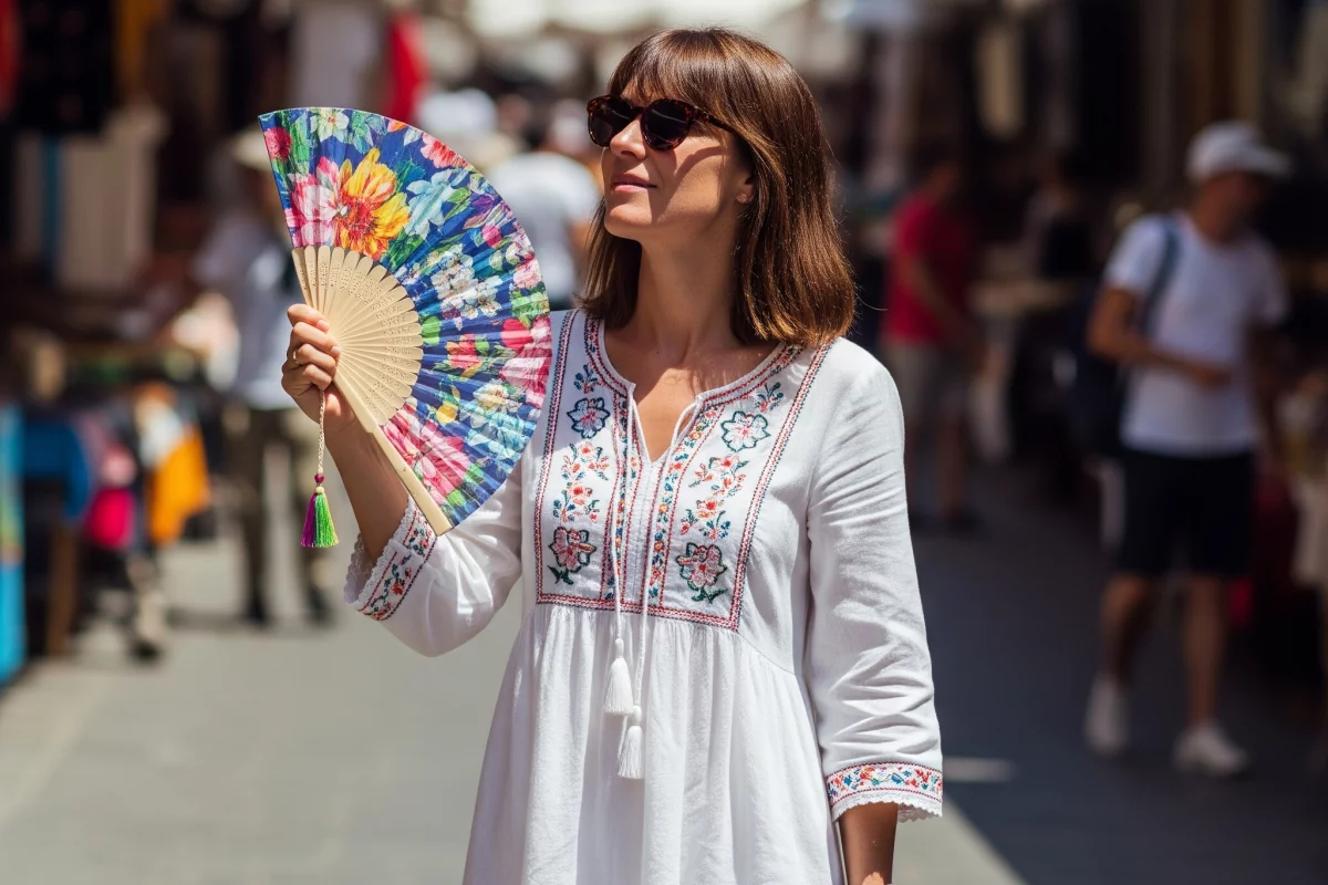 - Accessoires malins : lunettes de soleil XXL, chapeau en paille, éventail, sac en osier… Tout pour l'élégance et l'efficacité.