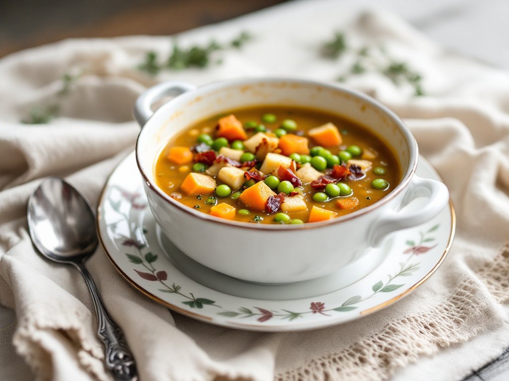 - Préparation : Faites revenir l'oignon et la carotte dans une grande casserole. Ajoutez les pois cassés, l'eau, le thym, le laurier et les saucisses. Laissez mijoter pendant 40 minutes, puis retirez les saucisses, coupez-les en rondelles et remettez-les dans la soupe. Mixez la soupe si vous préférez une texture lisse, ou laissez-la telle quelle pour une version plus consistante.