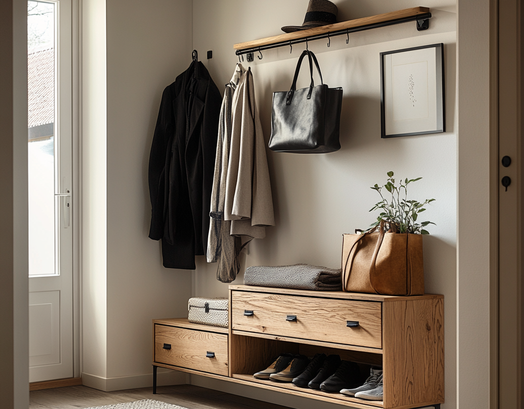 ✨ Astuce : Installez un meuble à chaussures étroit qui fait aussi office de console. Gain de place garanti !