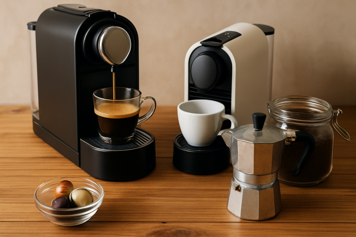 - Les machines à capsules/pods (Nespresso, Dolce Gusto, Tassimo) : elles sont rapides, propres et faciles. Mais elles coûtent cher à la longue et posent la question des déchets.