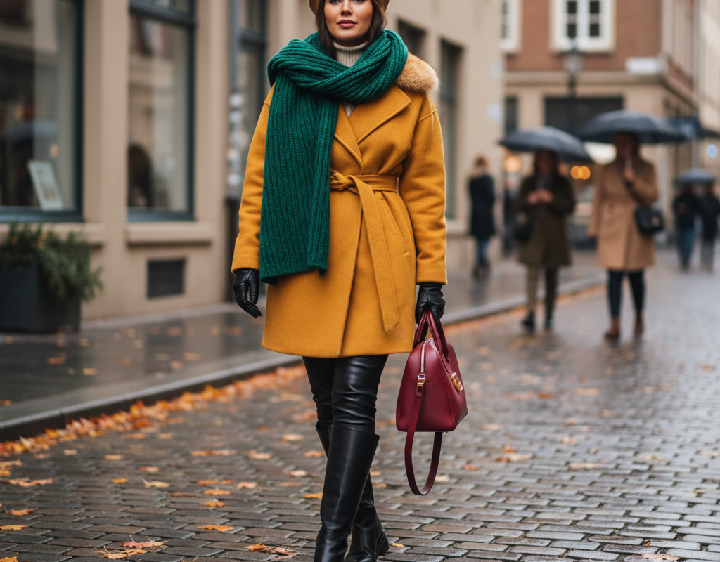 - Écharpes XXL : protègent du froid et ajoutent du volume à ta silhouette. Choisis des couleurs vives pour réveiller un manteau sombre.