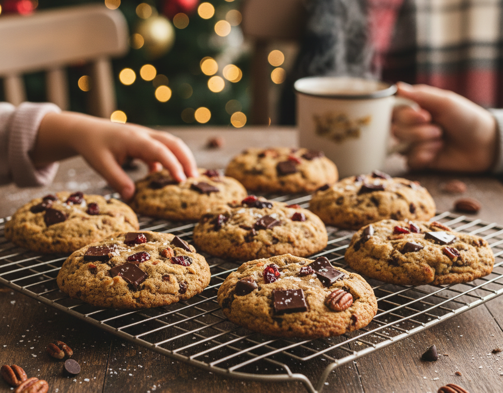 Quelques minutes après la sortie du four, l’odeur se diffuse partout. Un mélange de beurre chaud, de chocolat fondu et d’épices de Noël. C’est souvent à ce moment-là que tout le monde arrive dans la cuisine, sans raison apparente. Comme attiré par un signal invisible. Et c’est exactement ça, la magie des cookies de Noël.